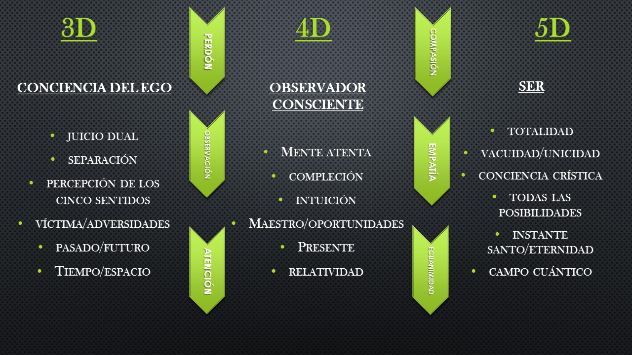 En el primer módulo (3D), trataremos los aspectos más básicos de la mente racional. Aquí es dónde reside el sistema de pensamiento del ego, la inteligencia intelectual y la capacidad de razonar correctamente. En este estado de conciencia, la mente es reiterativa, repetitiva e incluso obsesiva. Comprender porqué y para qué es así es comprender la manera de liberarte de todos los falsos razonamientos del ego. El objetivo en este módulo es aprender a desaprender observando, comprender la técnica del perdón, qué son los apegos y cómo afectan a nuestra vida, la mecánica y la dinámica del pensamiento y situar a la mente racional en el lugar que le corresponde dentro del Ser.